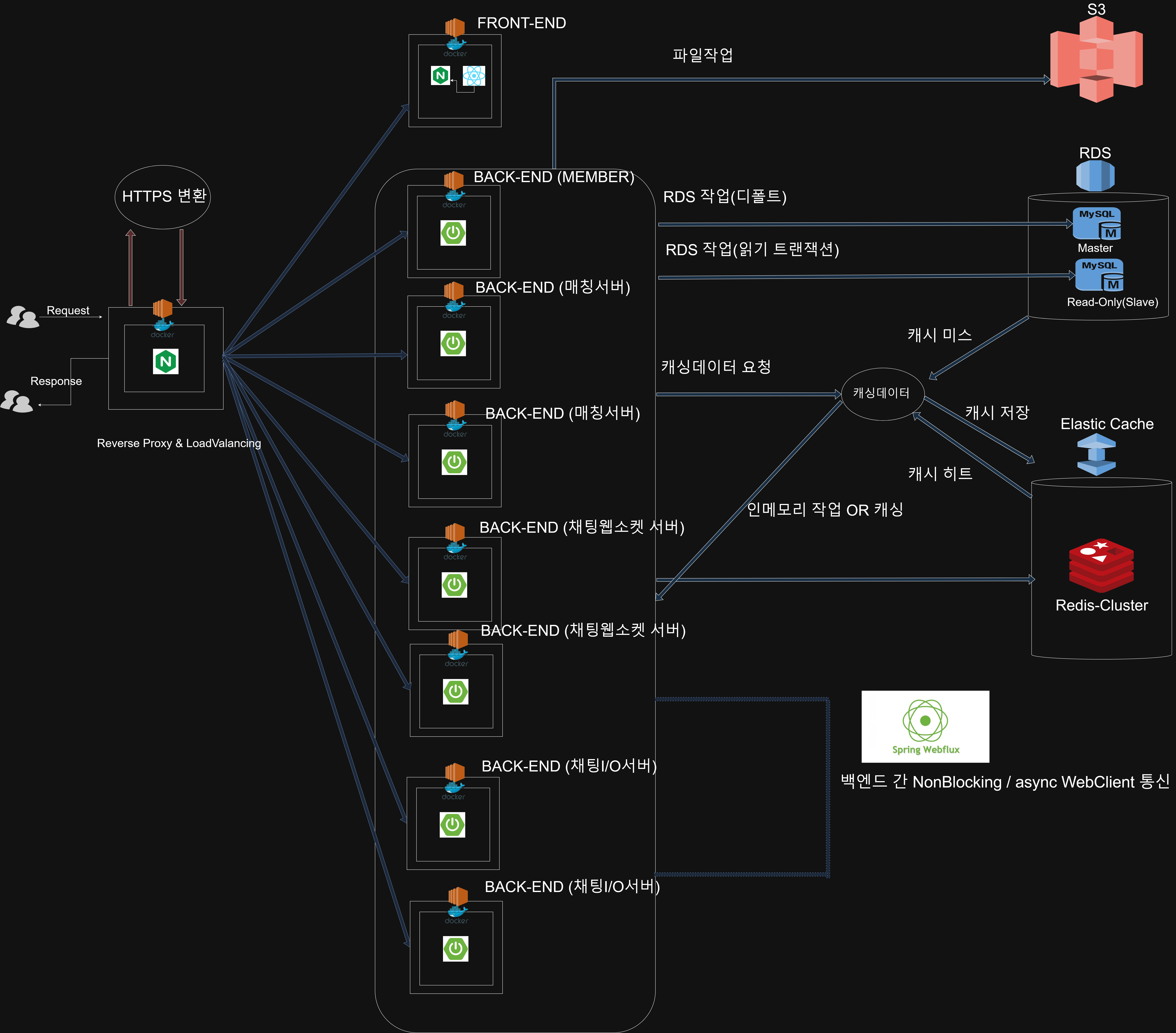 백엔드 - 회원서버 : EC2 1대 백엔드 - 매칭서버 : EC2 2대백엔드 - 채팅 웹소켓 서버 : EC2 2대백엔드 - 채팅 I/O 서버 : EC2 2대프론트엔드 서버 : EC2 1대 NGINX 서버 : EC2 1대RDS : 1대 (master+read_only)ElastiCache-redis : Single-Node 1대 스케일아웃 : RDS 마스터노드와 읽기복제본을 나누어 라우팅함으로써 데이터베이스 부하 분산스케일업: 스케일 아웃 제한 시 EC2 및 AWS 자원스케일 업 고려로드밸런싱 : 라운드로빈 방식 로드밸런싱으로 부하를 분산 ( 채팅,매칭서버에 해당 )ElastiCache를 통해 캐싱을 적극 활용하여 I/O부하를 줄인다배포 프로세스에 성능테스트를 추가한다.(2024-12-14 계획중)웹소켓 서버에서의 I/O 작업부하를 줄이기 위해 I/O를 담당하는 인스턴스 추가 및 서버간 WebClient를 통한 통신 서비스별 독립 배포 : 하나의 인스턴스가 장애가 났을 시 다른 인스턴스 대체가능 및 다른 서비스에 영향이 가지않음 RDS 장애 시 읽기복제본 자동 승격ElastiCache를 클러스터모드로 변경하여 고가용성 보장 Nginx 리버스 프록시를 통해 분산되는 자원에 대한 정보를 보호 https / SSL 적용 (certbot)jwt토큰을 통해 인증과 인가를 구현하고 , 이 외에도 특정 서비스에 특별한 인증이 필요하다면 커스텀 토큰을 발급하여 활용AWS 키값, properties 값 노출 절대금지 (깃허브액션 secret변수 활용)