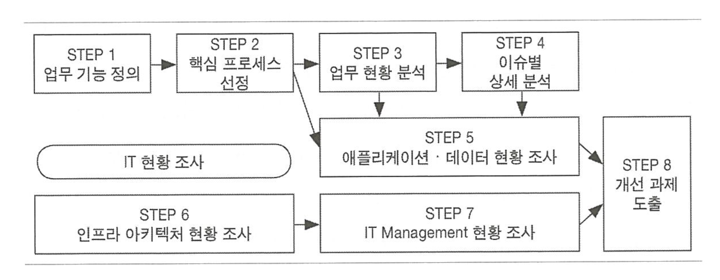 | 1. 환경 및 현황 분석 | 경영 환경 분석(3C, SWOT), 정보기술(IT) 동향 분석, 현행 업무 프로세스(As-Is Process) 및 정보화 현황 진단, 문제점 및 개선 요구사항 도출. | 경영환경 분석 보고서, IT 동향 분석 보고서, 현행 시스템 및 업무 분석서 | As-Is 아키텍처 분석, 현행 기술 및 인프라의 취약점/갭(Gap) 도출. |