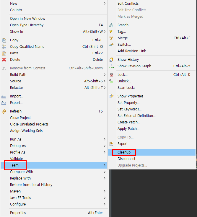 다시 프로젝트로 돌아와 Team - Cleanup 하면 아무렇지 않게 다시 Commit 이 되는 걸 경험할 수 있습니다.