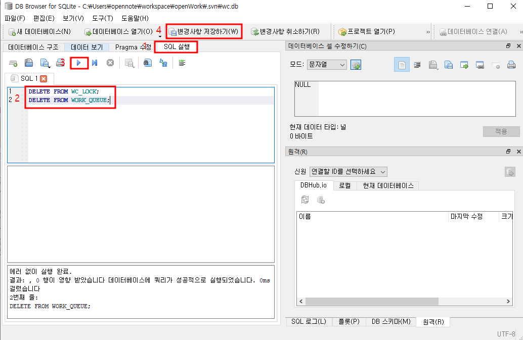위 쿼리문 입력 - 전송 - 반드시 변경사항 저장하기 클릭!