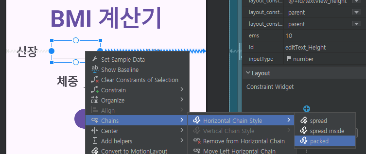 질문! 가운데 숫자 입력창을 기준으로 센터를 맞추면 chain 후 packed 선택창이 안 뜨는데 이유가 있나요?
