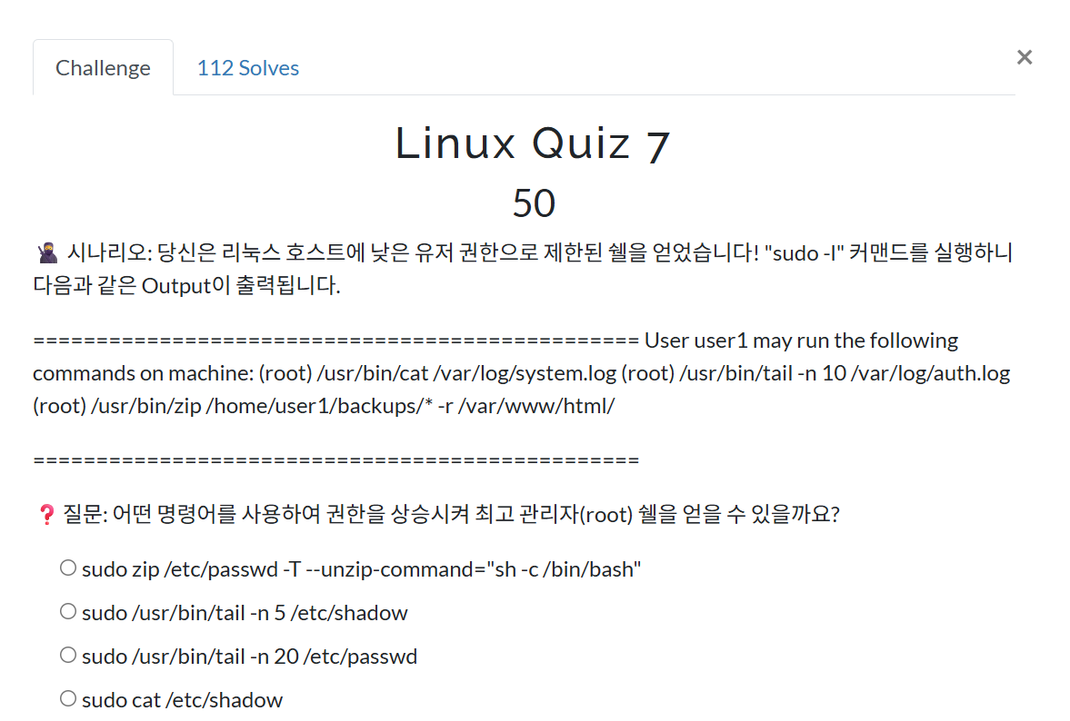 권한을 상승시키려면 zip을 사용해야 한다. /var/www/html/ 디렉토리는 웹 서버의 루트 디렉토리로, 여기서 취약점을 이용해 웹 서버에 접근할 수 있기 때문이다.