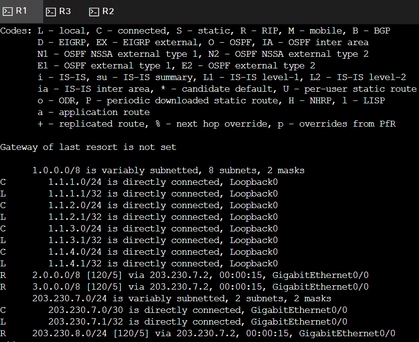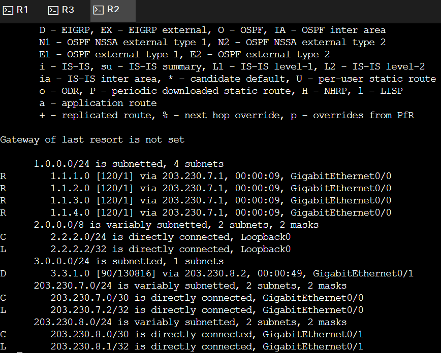 - R2에는 EIGRP와 RIP가 동시에 설정되었고, 사진과 같이 RIP로 등록된 경로 R과 EIGRP로 등록된 경로 D가 공존하는 것을 볼 수 있음
