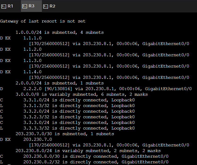 - EIGRP로 동작하는 R3 라우터에서의 R1-R2 구역의 네트워크는 EIGRP로 탐색했지만, 재분배가 일어났다는 것을 의미하는 EX 표시가 붙어 표시됨