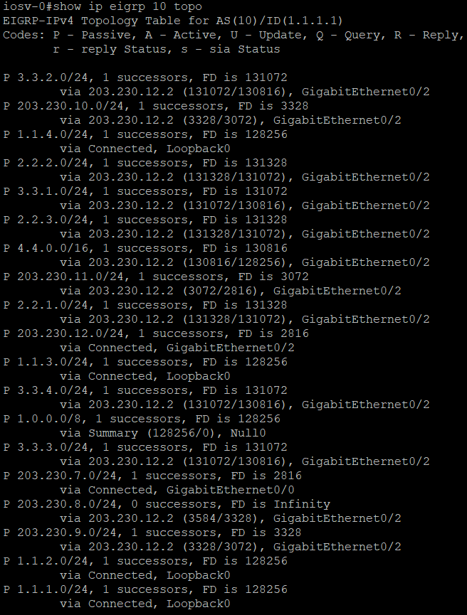 - topology table은 EIGRP를 통해 얻은 모든 ip에 대한 경로 정보와 어느 포트에 할당되어 있는지, successor가 몇 개인가와 FD 값까지 기록
