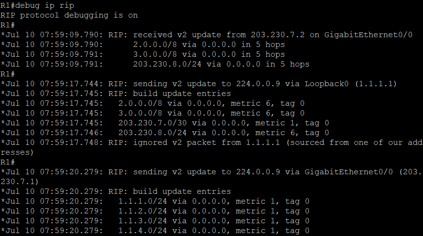 - R1에서 debug ip rip을 했을 때, 실제로 EIGRP to RIP 설정을 통해 R2에 설정된 루프백 2.0 대역과 R3에 설정된 루프백 3.0, R2-R3 대역인 8.0 대역으로 향하는 metric 값이 5 증가된 것을 확인할 수 있었음