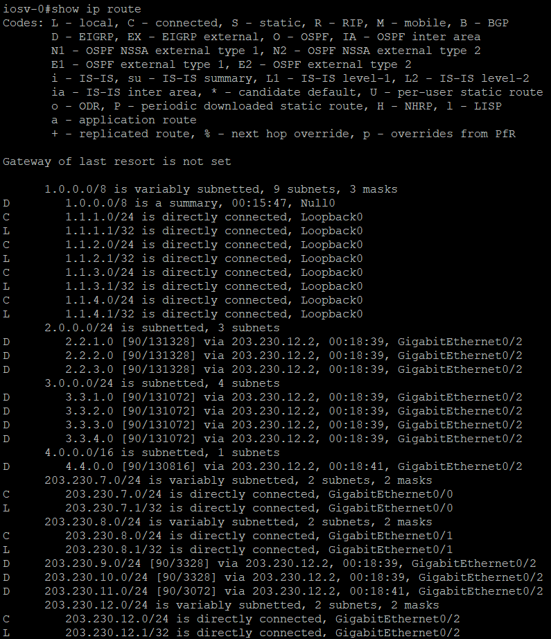 - 사진에서 알 수 있듯이, EIGRP로 탐색하고 설정한 경로는 D로 표시됨