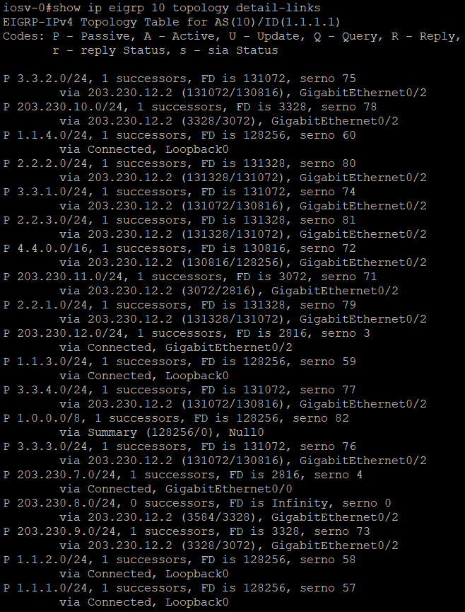 - 해당 사진은 show ip eigrp {AS ID} topology detail-links를 입력했을 때 출력되는 topology table로, 일반 토폴로지 테이블보다 더 상세한 정보가 기록됨