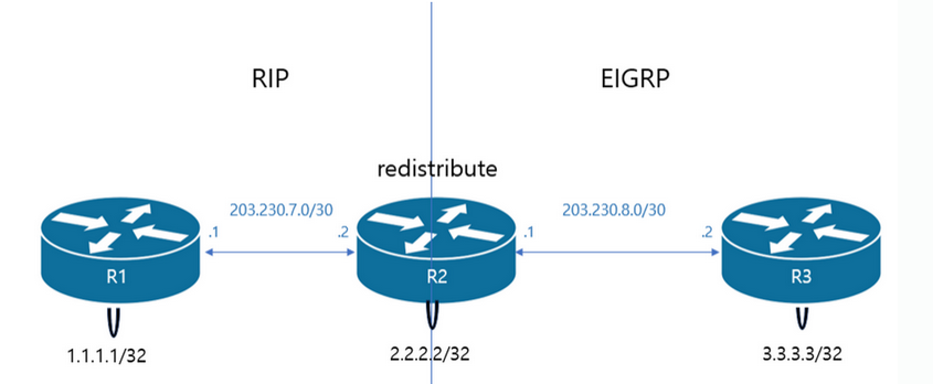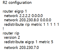 - R2에는 단순 RIP와 EIGRP 선언만 된 것이 아니라 R1과 R3 사이에서 일어나는 프로토콜의 차이를 매꾸기 위한 재분배 명령어가 추가로 입력됨