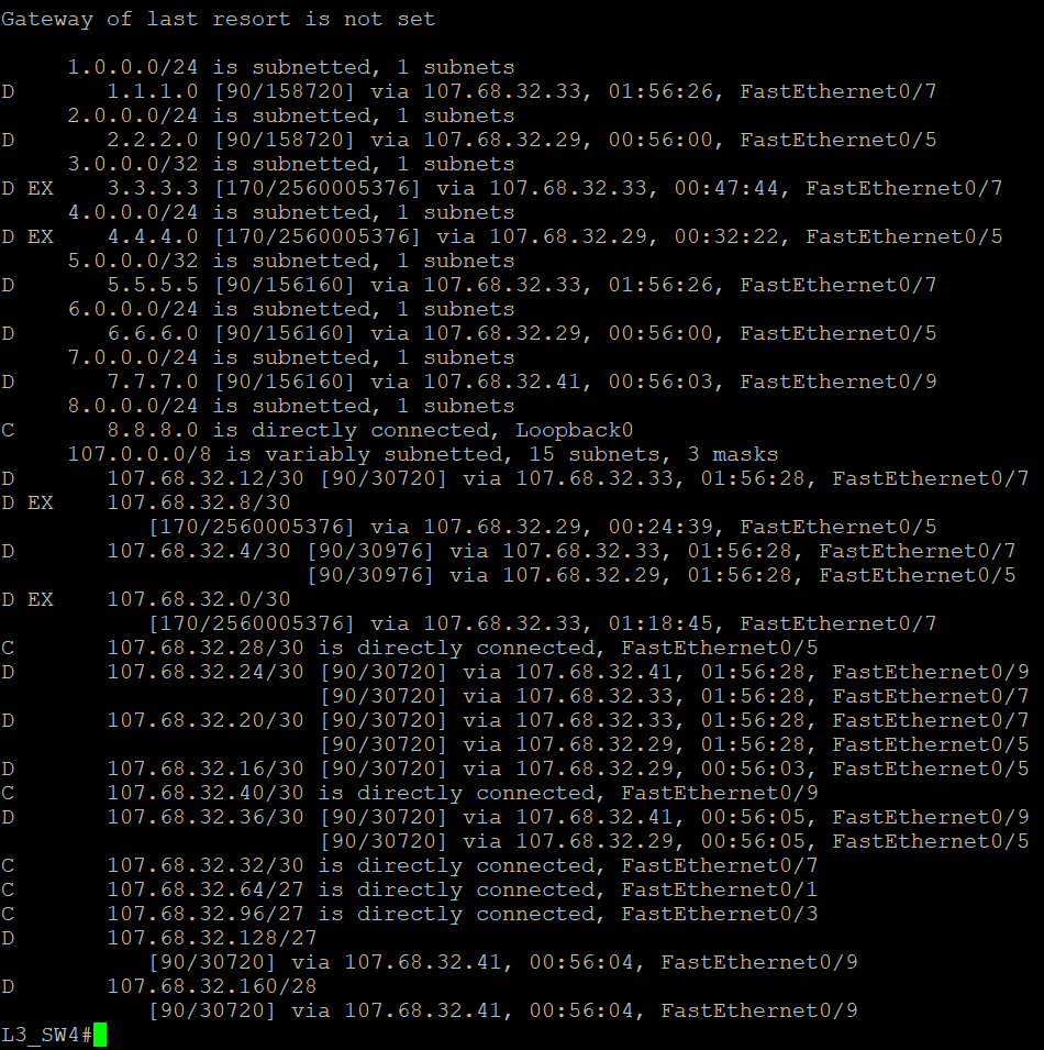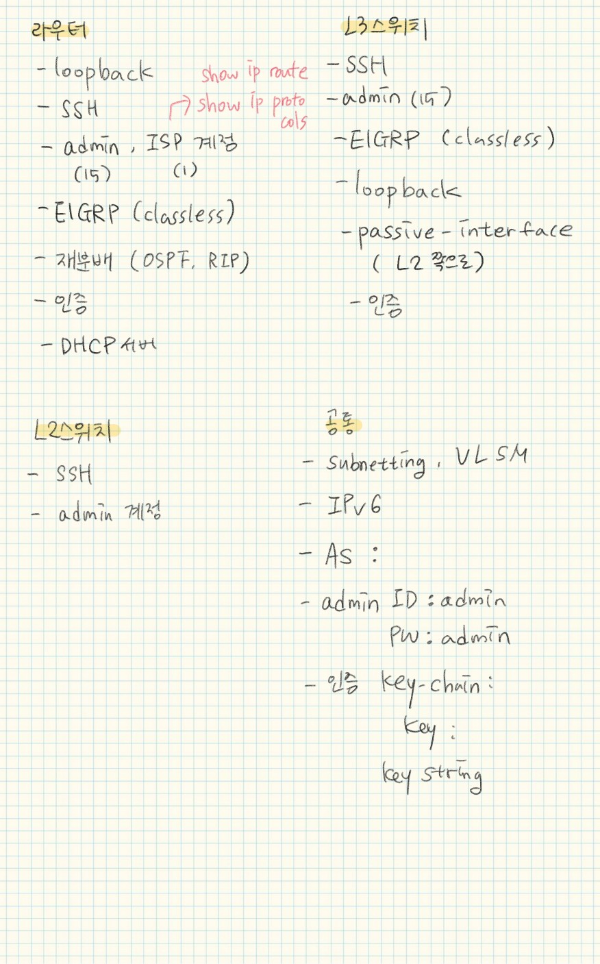 - L3 스위치와 라우터에는 반드시 loopback IP를 설정해 주어, EIGRP의 router id가 자동으로 등록되도록 설정