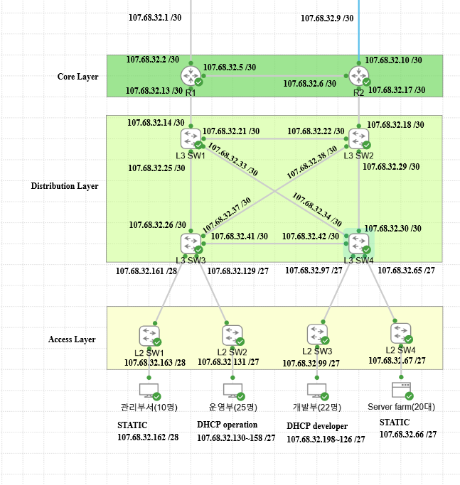 - L3 스위치 설정, 라우터와 같이 동작하도록 설정 (Distribution Layer)