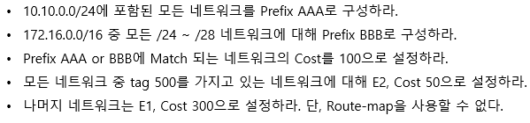 - 현재 문제의 조건을 만족시키는 방법은 위의 사진과 같은 방식이 있는데, Default 값을 route map과 재분배를 통해 원하는 값으로 바꾸어 넘기는 방법