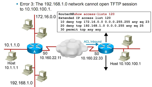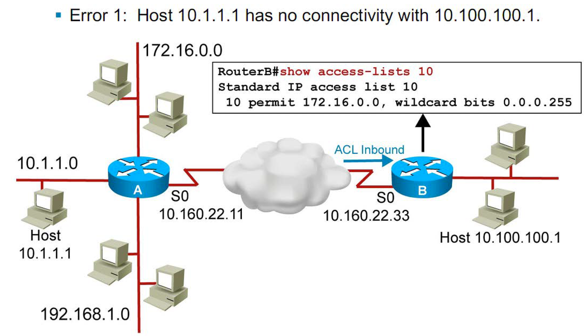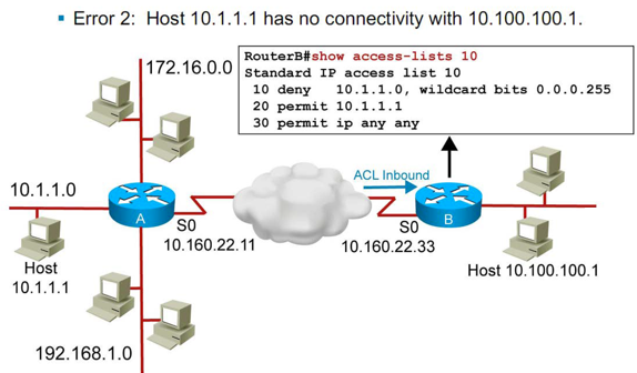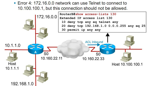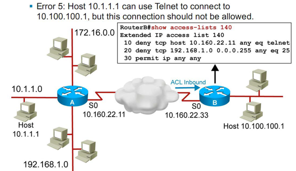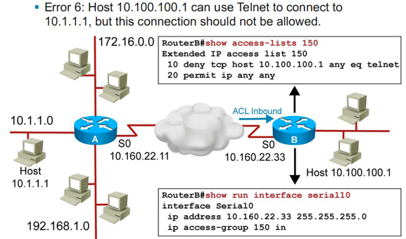 - Error7, 10.1.1.1이 Router B의 주소로 telnet 접속 가능, ACL은 telnet 접속 차단 목적으로 작성