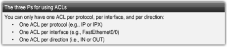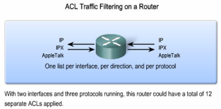 - 두 인터페이스와 3개의 프로토콜이 동작할 때, 해당 라우터는 총 12개의 개별 ACL이 들어갈 수 있음