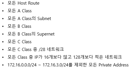 - ge 또는 le 옵션이 없으면 특정 주소에 대해서만 Prefix Matching을 검사하겠다는 의미