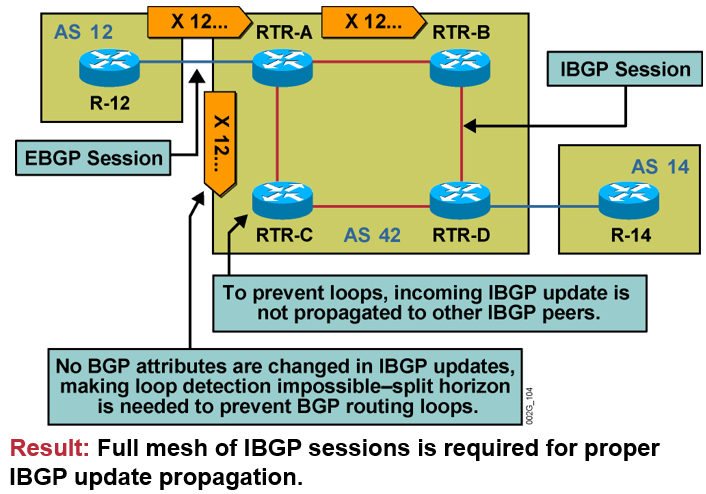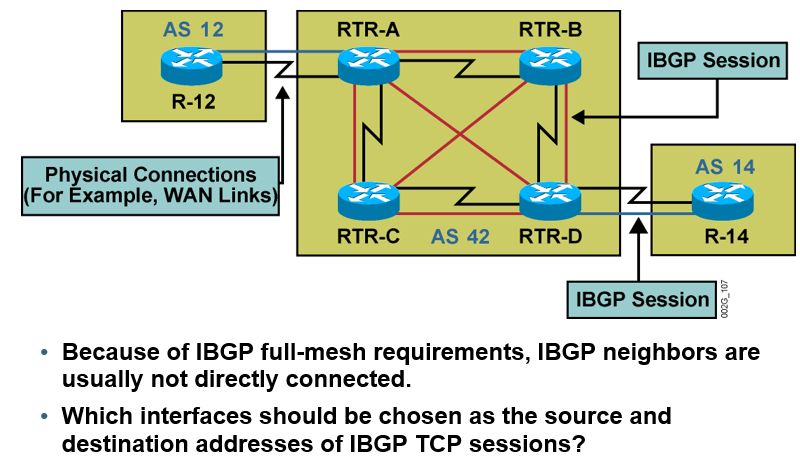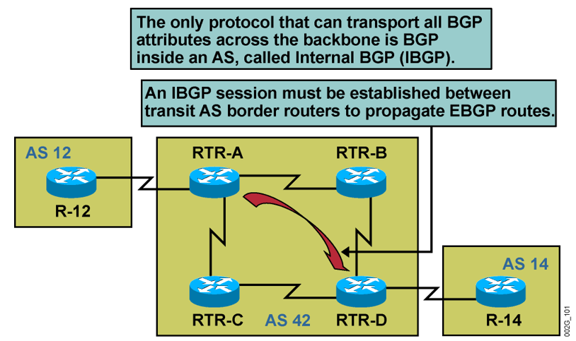 - EBGP 경로를 홍보하려면 IBGP 세션이 transit AS Border Router 사이에 형성되어야 함