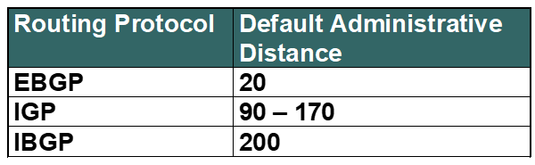 - 일반적으로 EBGP는 20, IBGP는 200의 AD를 가짐