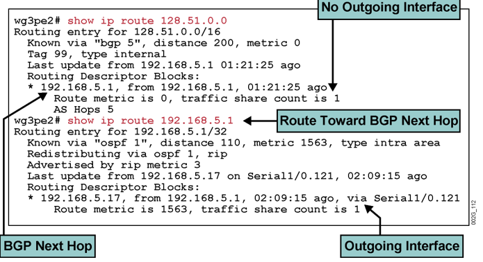 - BGP를 통해 학습된 경로는 라우팅 테이블에 연관된 발신 인터페이스가 존재하지 않음