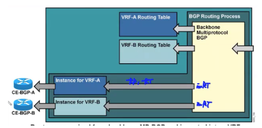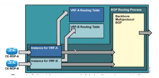- 외부에서 고객한테 BGP로 정보 전달받으면, BGP로 받은 정보가 VRF Table에 내려감