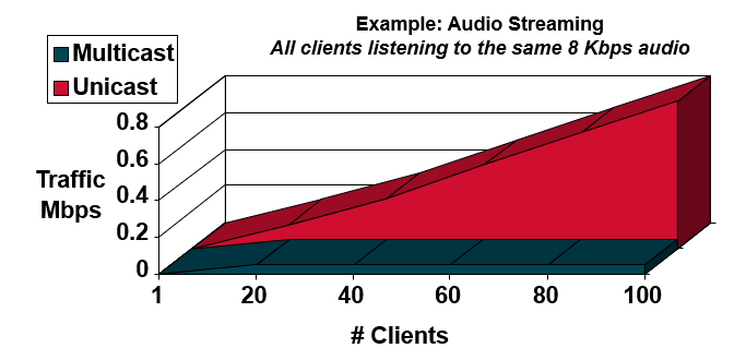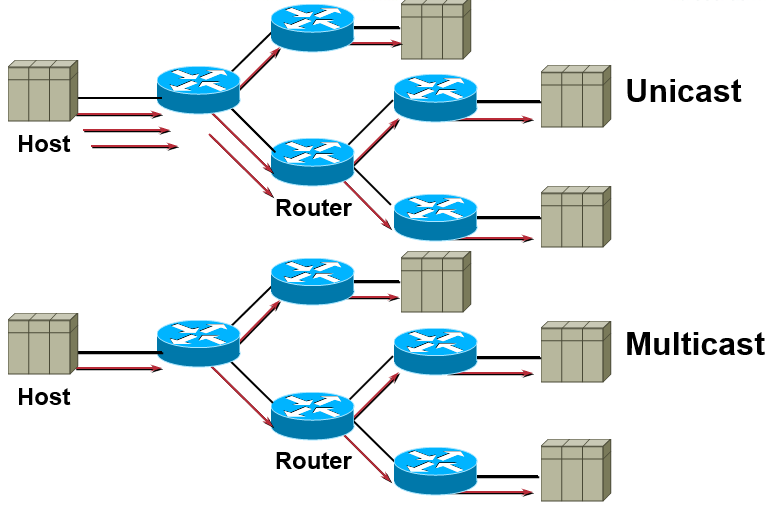 - Unicast와 다르게 Multicast는 하나의 데이터를 각 라우터에서 복제하여 각 사용자로 전송하기에 resource 사용률과 기기 부하가 적음