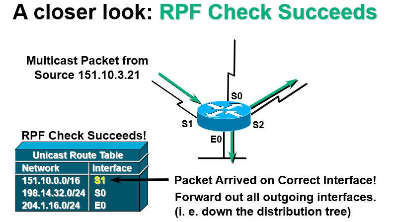 - RPF check가 succeed되면, 데이터그램은 포워딩됨