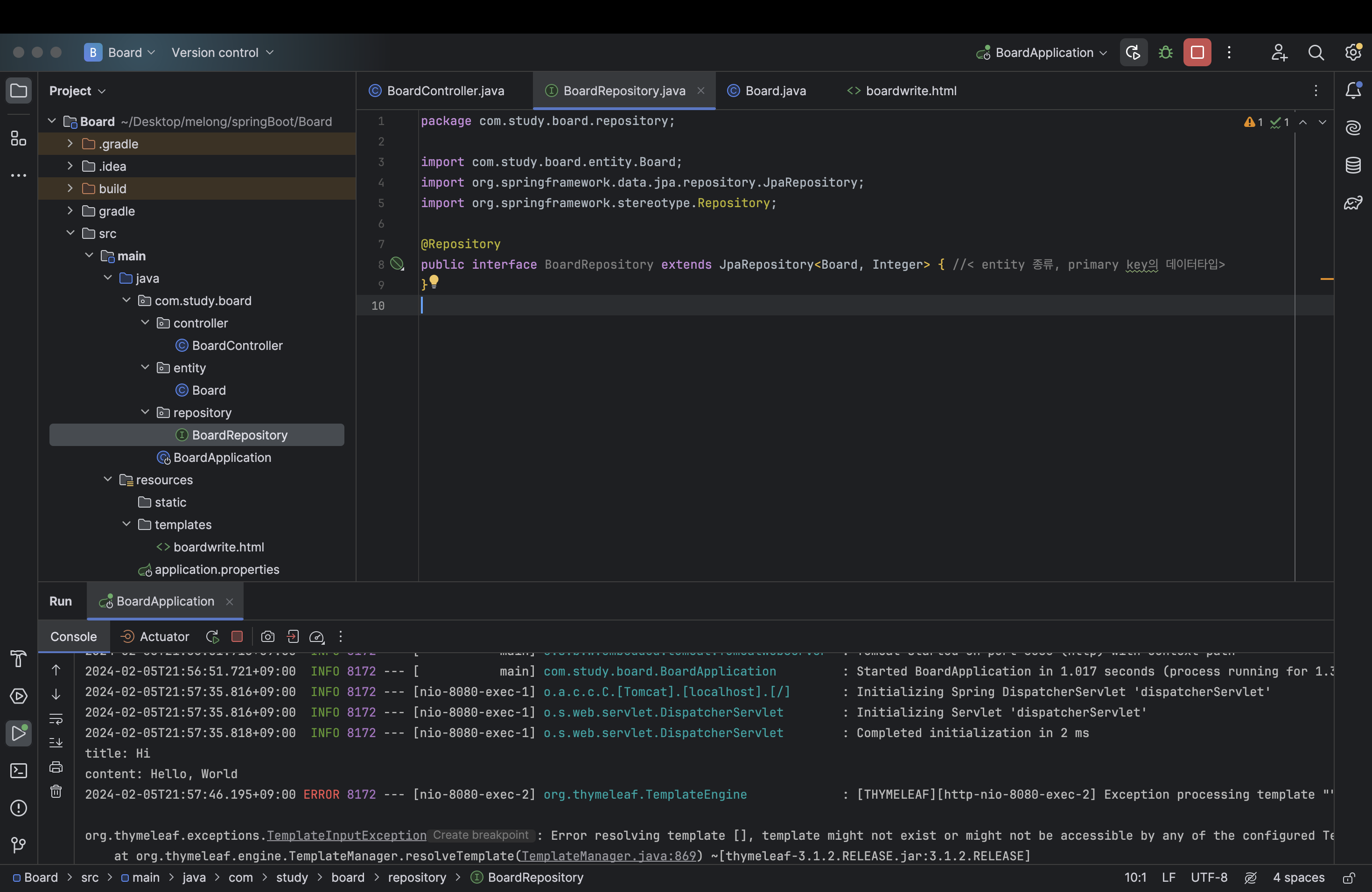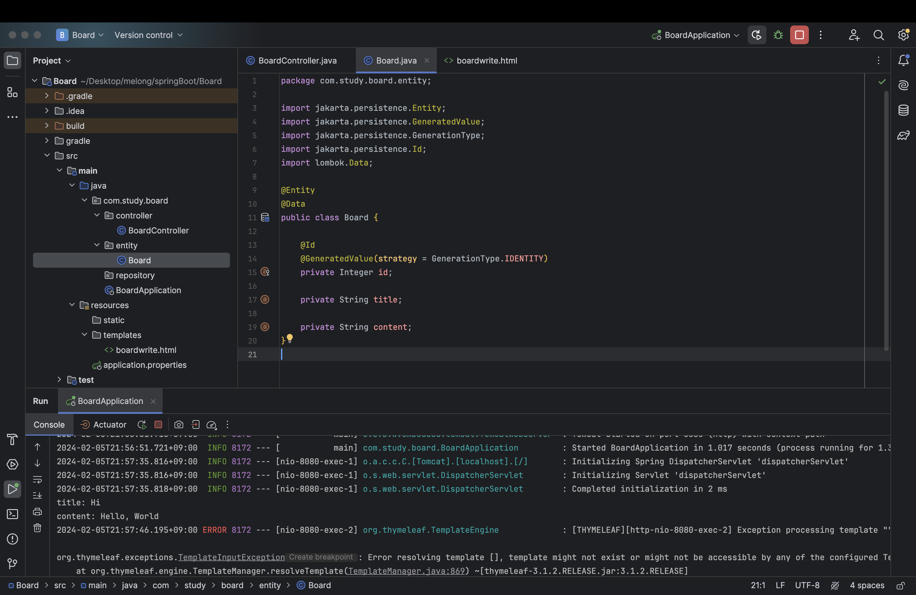 그리고 entity 하위에 Board 자바 파일을 하나 생성해주고 아래처럼 코드를 작성해준다.