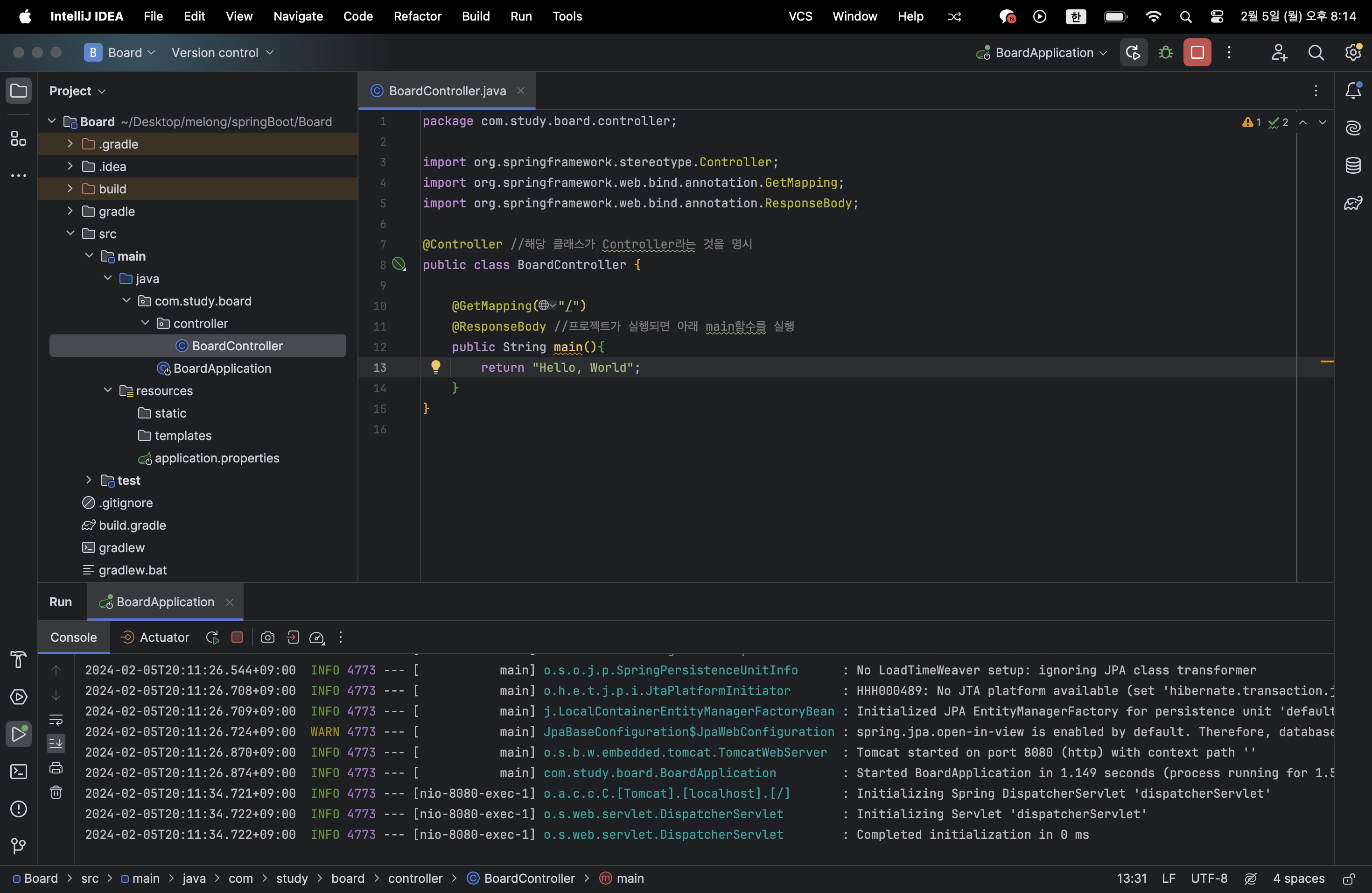 src - main - java - com.study.board 하위에 controller 패키지를 추가해주고 BoardController 를 추가해주자.