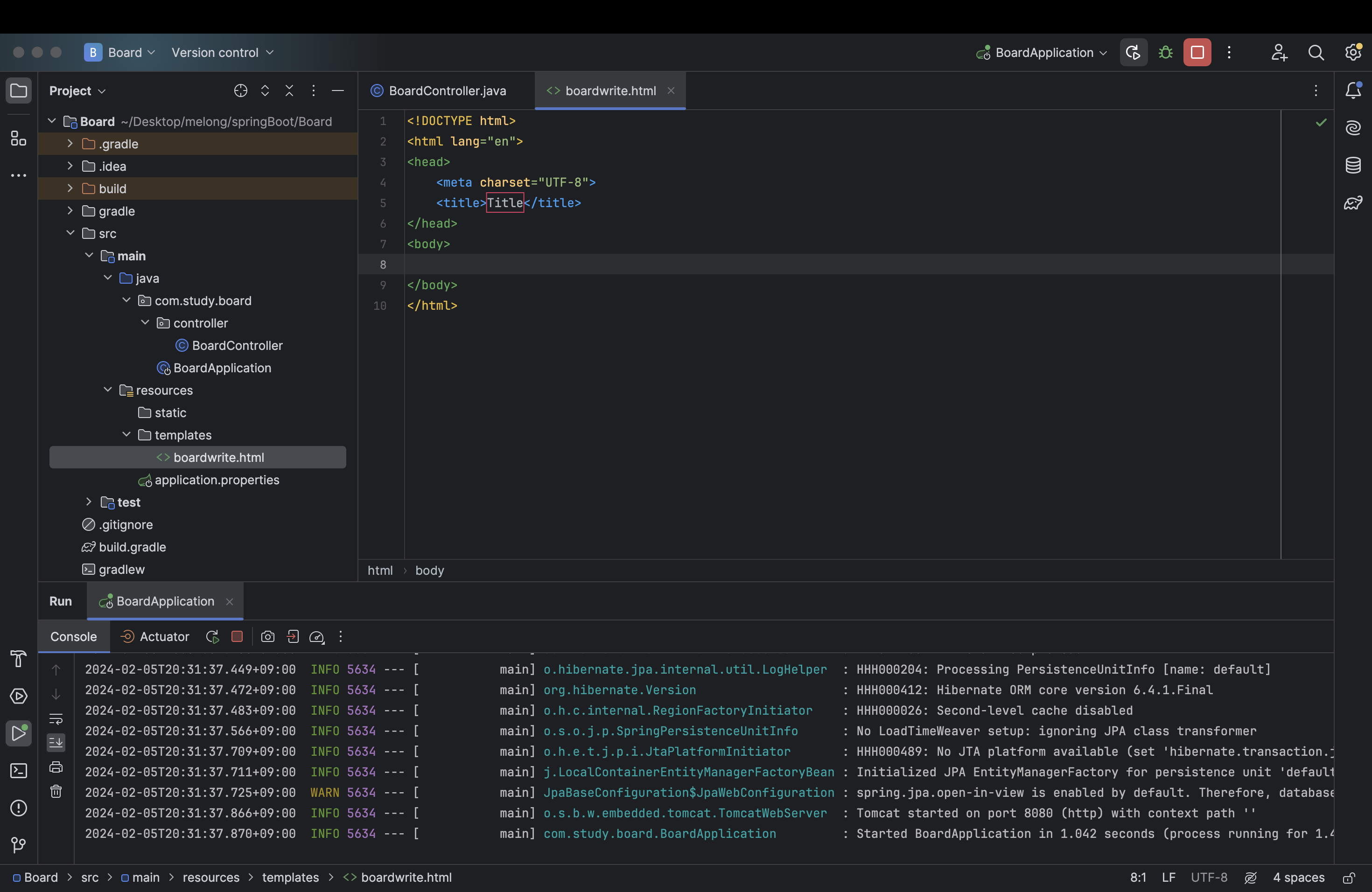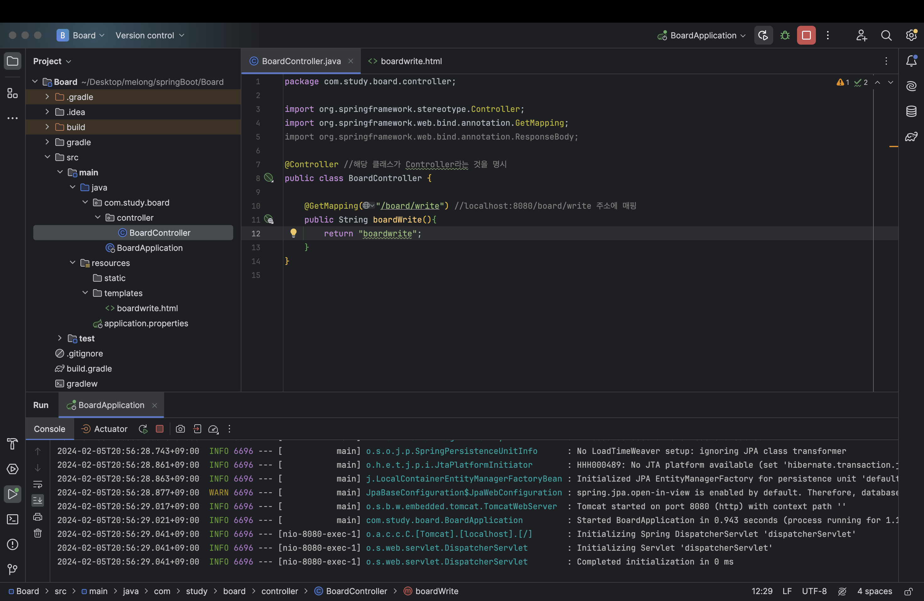 기존에 있던 main 부분을 삭제하고 다시 작성해보자. /board/write 에 사용자가 접속하면 boardwrite 라는 html 파일을 리턴해주면서 화면에 우리가 작성한 boardwrite가 보이게 될 것이다.