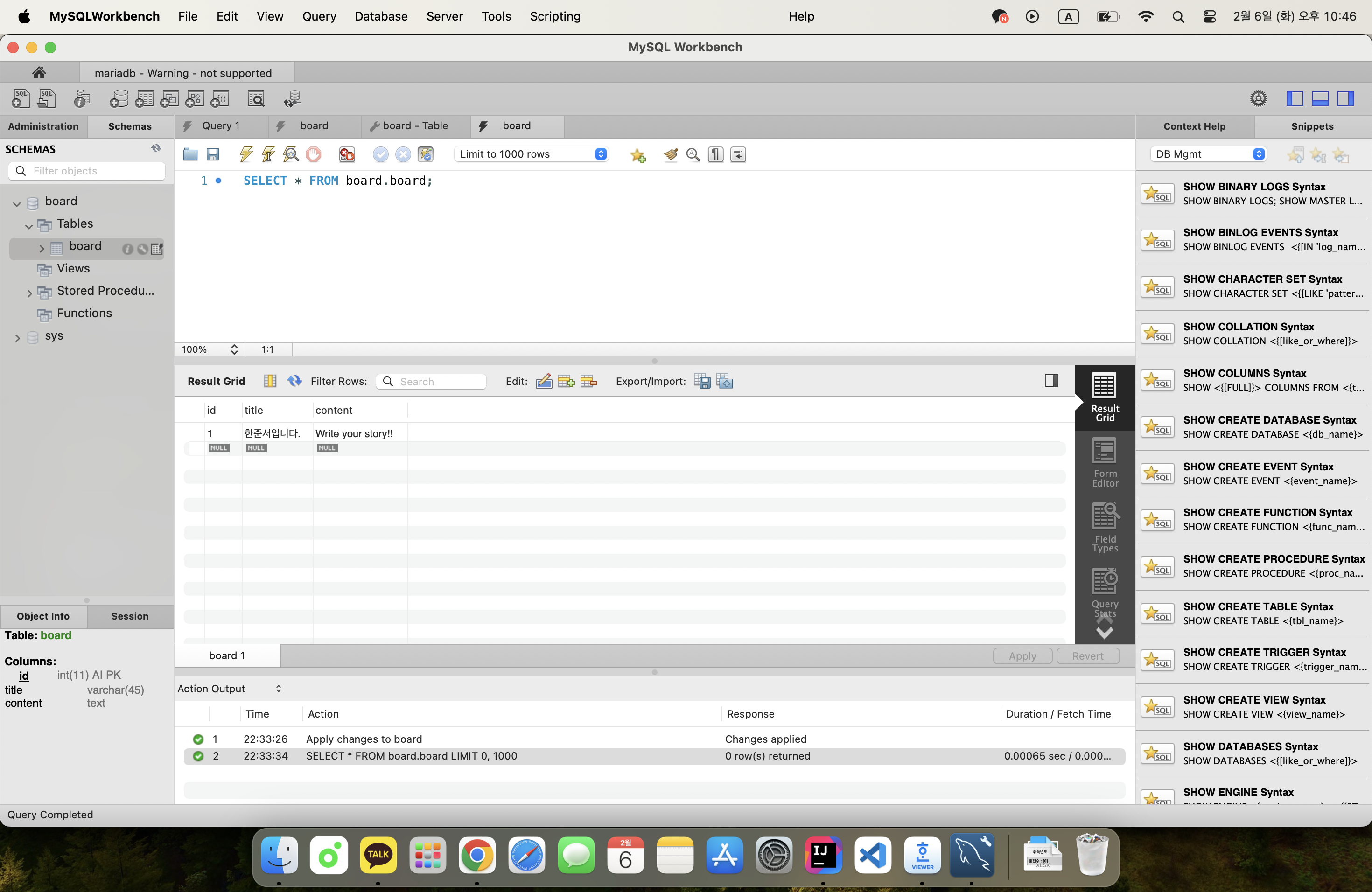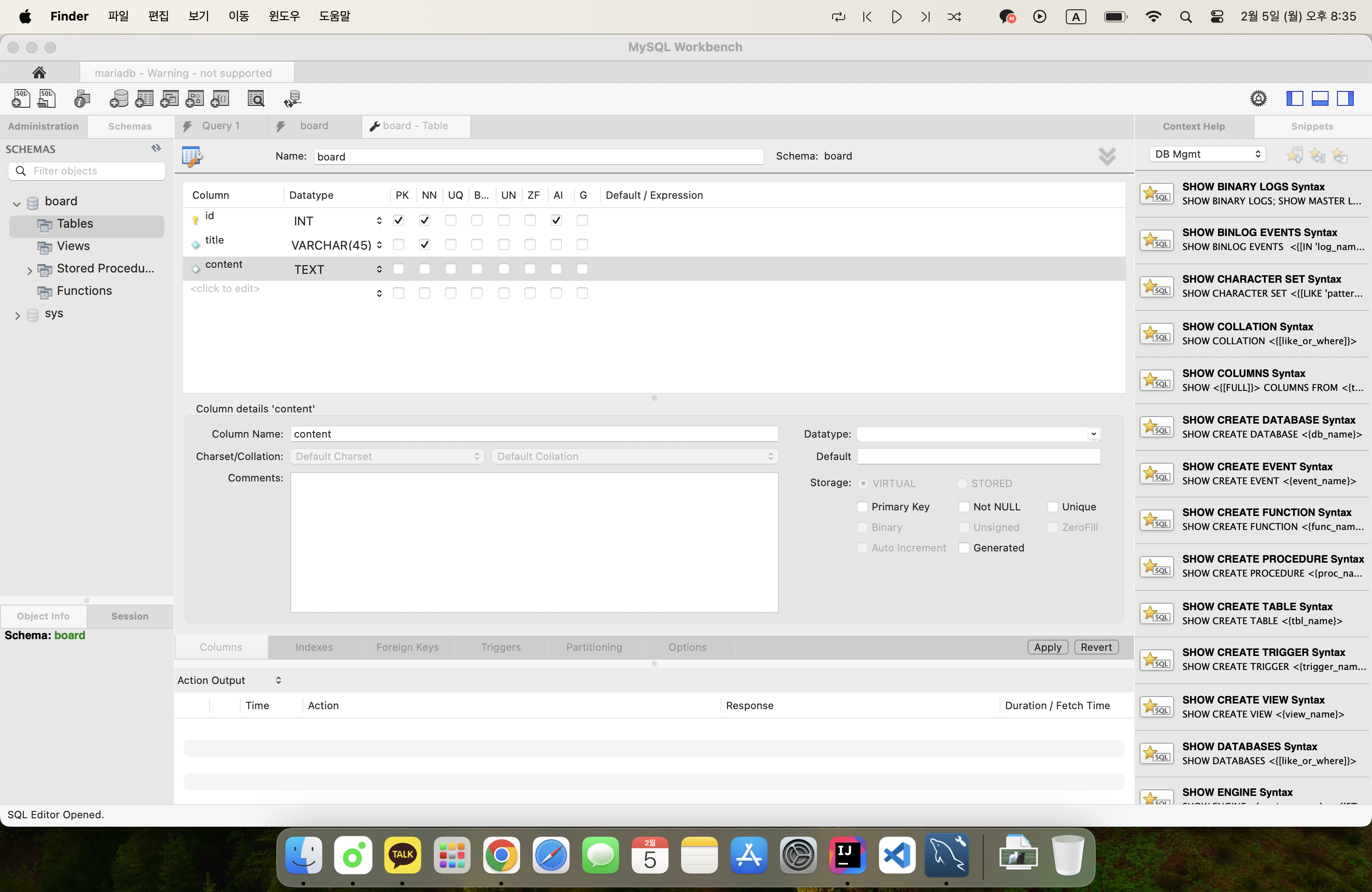 💻 이제 본격적으로 게시물 작성 페이지를 만들어보도록 하자. 그 전에 데이터를 저장할 mariadb에 테이블을 먼저 만들어주자.