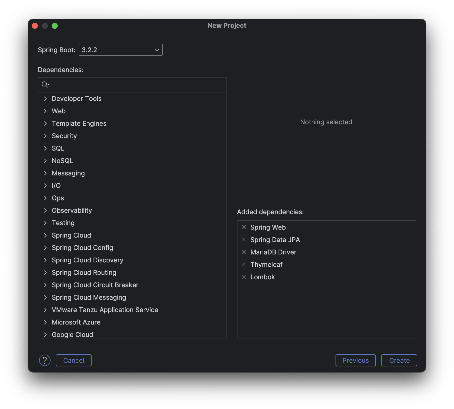 Next 를 클릭하면 다음과 같이 Dependencies 를 추가해주는 창이 나오는데 Added dependencies 에 추가되어 있는 항목을 왼쪽 위 검색창에 검색해 체크해주면 된다. ( dependencies 는 편리한 개발을 위해 보조해주는 도구 정도로 생각하면 좋다. )