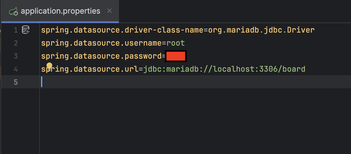 line3의 빨간 빈칸에는 mysql workbench에 생성한 mariadb 의 paasword를 넣어주면 된다.