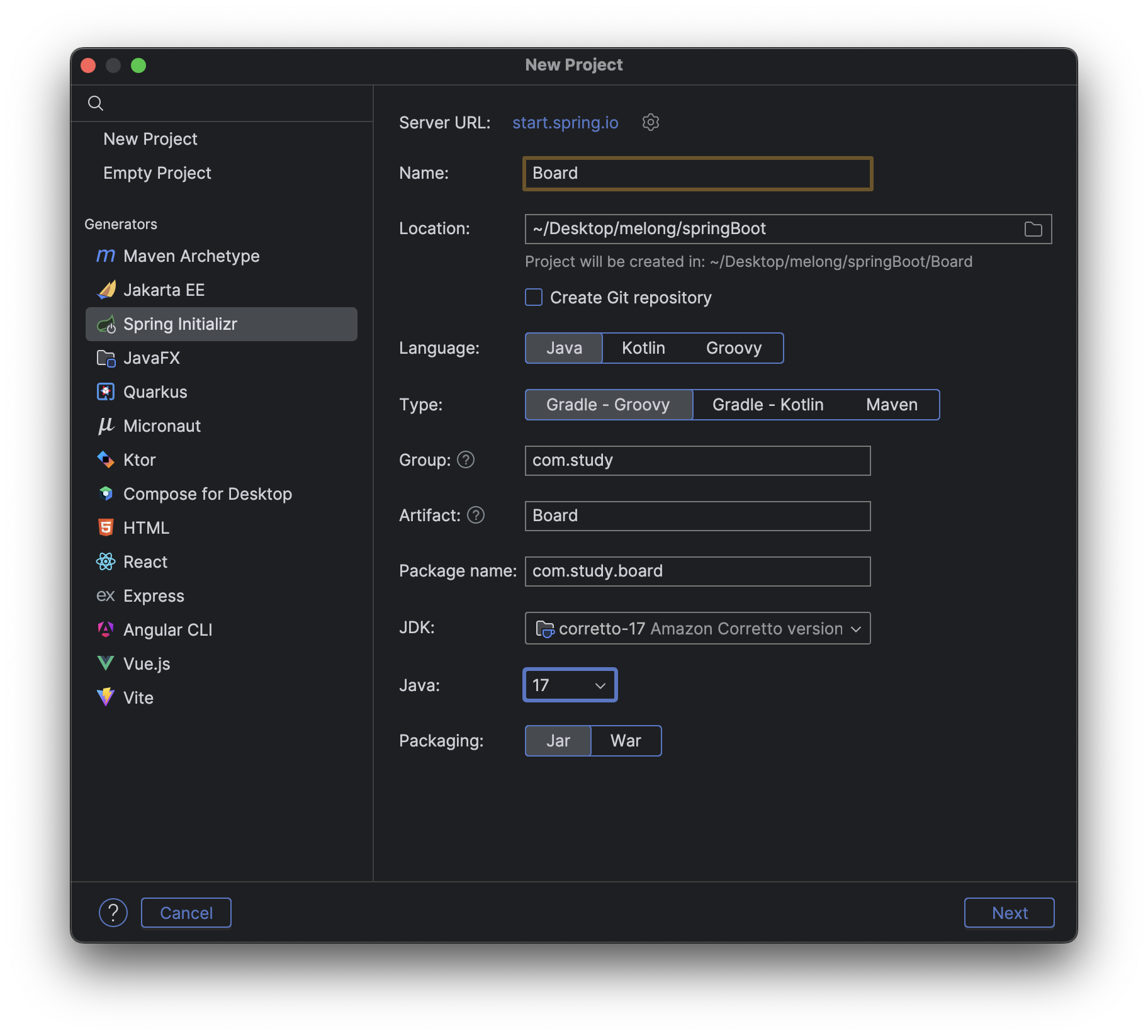 Generators 에서 Spring Initializr 를 선택해주고 위 설정처럼 변경해준다.