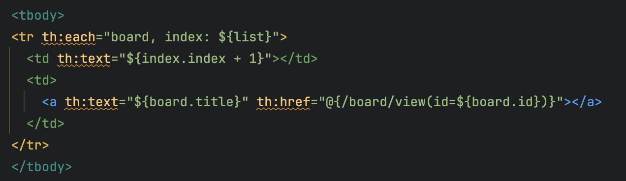boardlist 의 <tbody> 부분을 다음과 같이 수정하자. 방금 설명한 방식을 적용한 것이다. 더이상 목차 부분을 board.id 로 할당하지 않고 thymeleaf 의 메소드인 #lists.size() 를 사용해 게시물의 수를 구하고 게시물의 번호를 매핑하는 방식이다.
