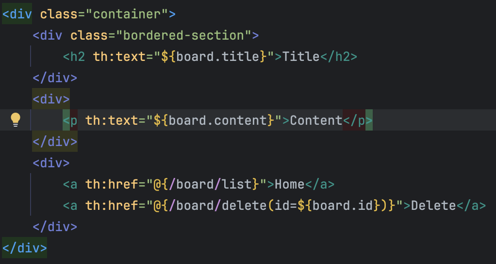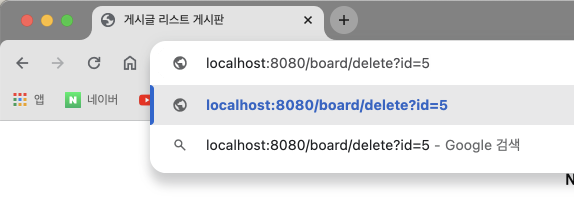 아까 만든 Delete 버튼 테그를 다음과 같이 수정해준다. 여기서 조금 더 생각해보면 /board/delete?id=5 로 이동하면 5번게시물이 삭제되었다. 이것을 Delete 버튼을 누르면 해당 주소로 이동할 수 있도록(삭제할 수 있도록) 해준 것이다.
