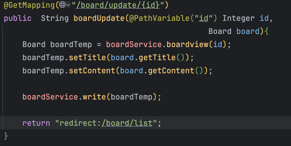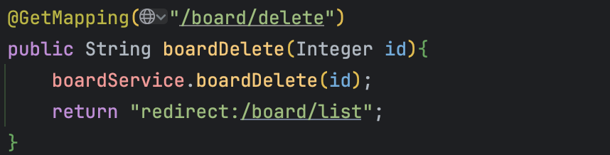 Controller 로 돌아와 /board/delete 주소를 매핑해주자. return 값에 들어있는 redirect:/board/list는 삭제 후 해당 주소로 다시 돌아가는 것을 의미한다.