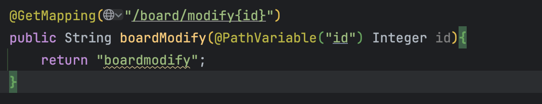 Controller 로 돌아가 해당 주소를 매핑해주자. 여기서 @PathVariable 이라는 키워드가 등장하는데, 매핑된 주소의 {id} 를 가져와 Integer id 에 대입해주는 역할을 한다.