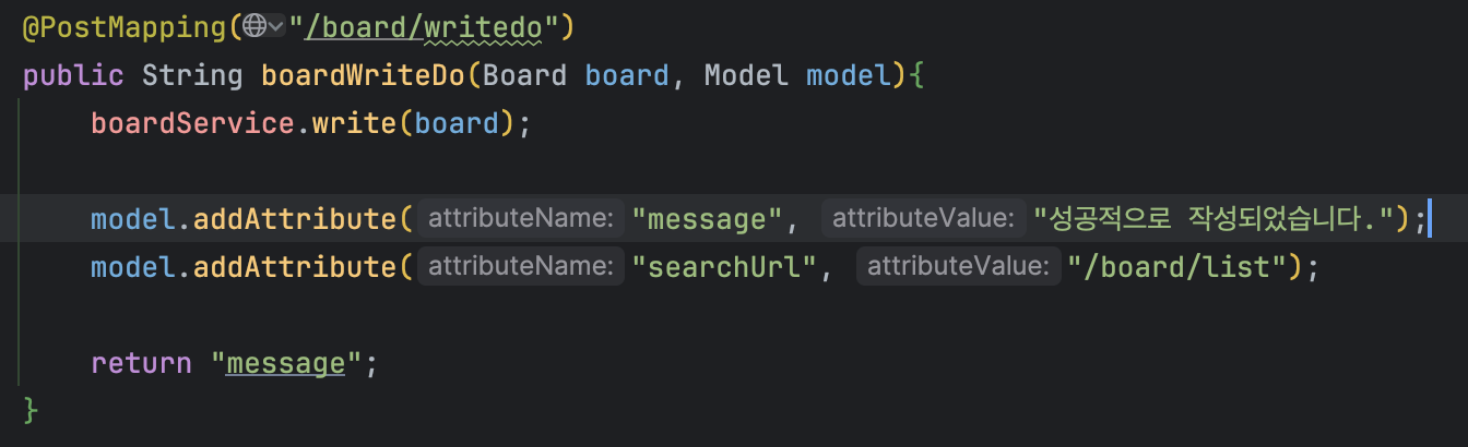 그리고 다시 Controller 로 돌아와 아래와 같이 수정해주자. 전달할 메시지 와 알람을 띄워주고 이동할 url을 넘겨줄 것이다.