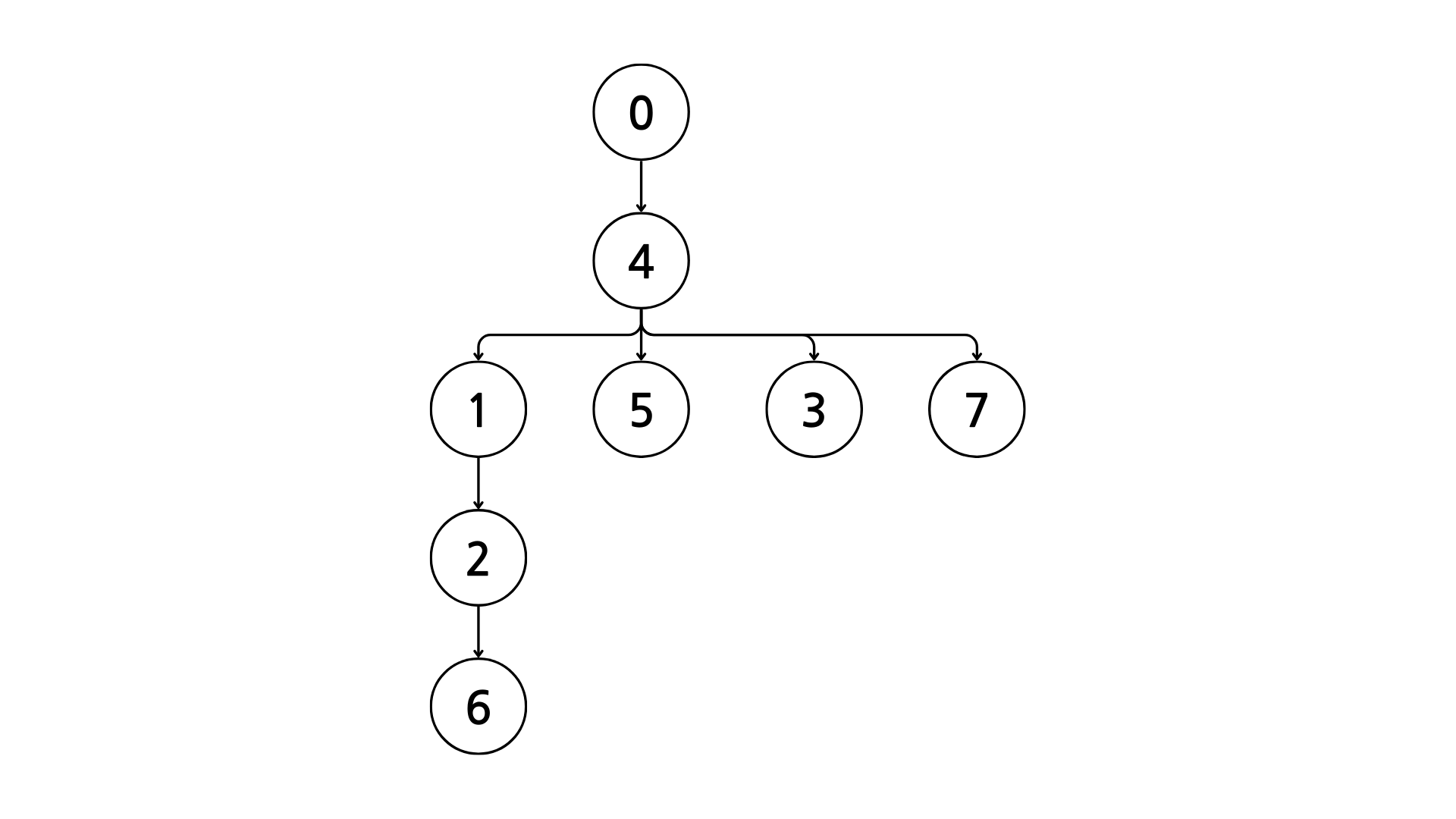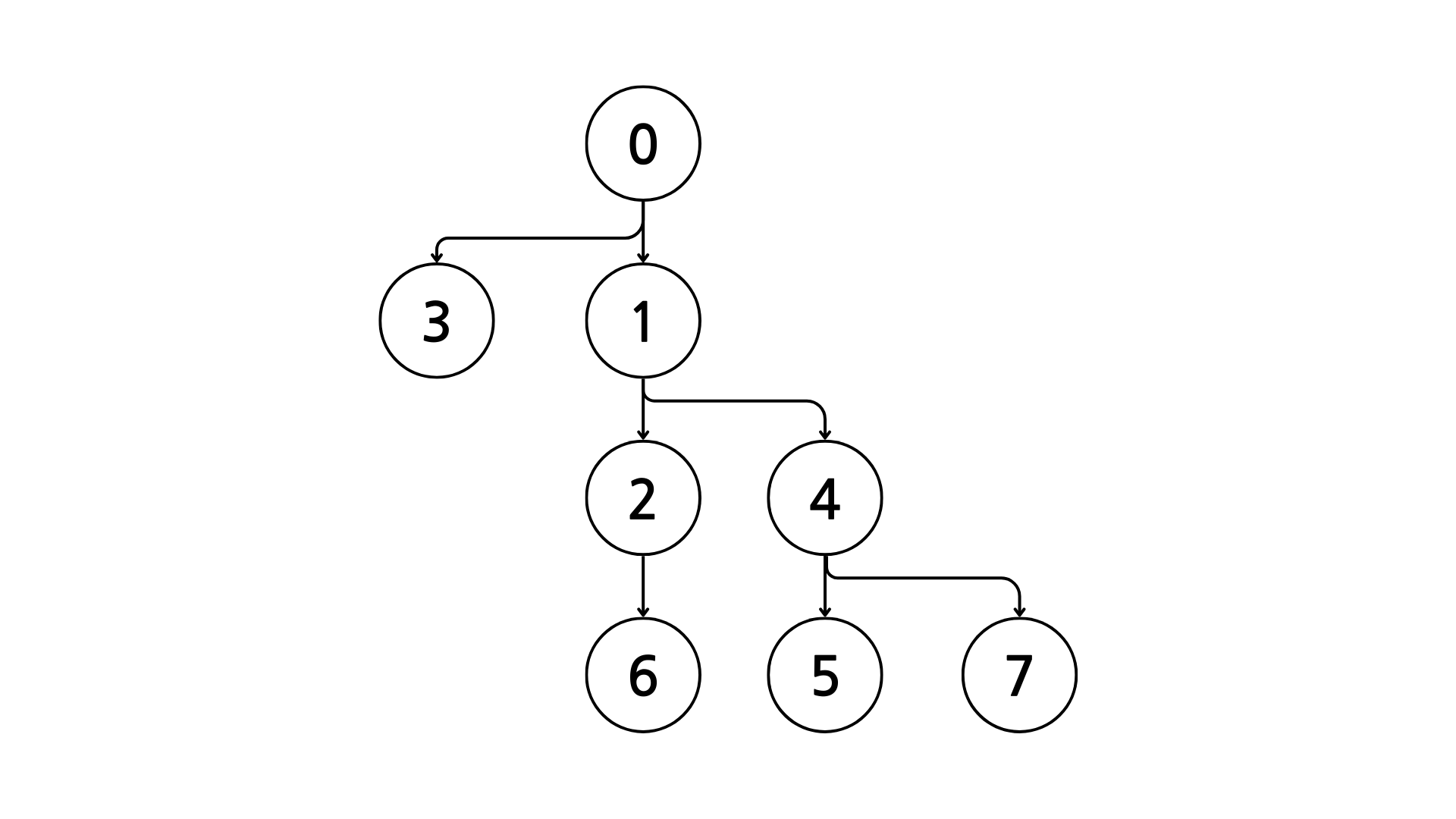 왜냐하면 트리를 형성해줄 때 부모-자식 노드를 양방향으로 연결했기 때문에 0번 노드에 다른 원이 두 개 이상 연결 되어 있다면 아래 이미지처럼 다시 0번 노드로 나갔다가 0번 노드에 연결되어 있는 다른 원에 먼저 방문하게 되므로 잘못된 깊이 정보가 저장되기 때문이다.