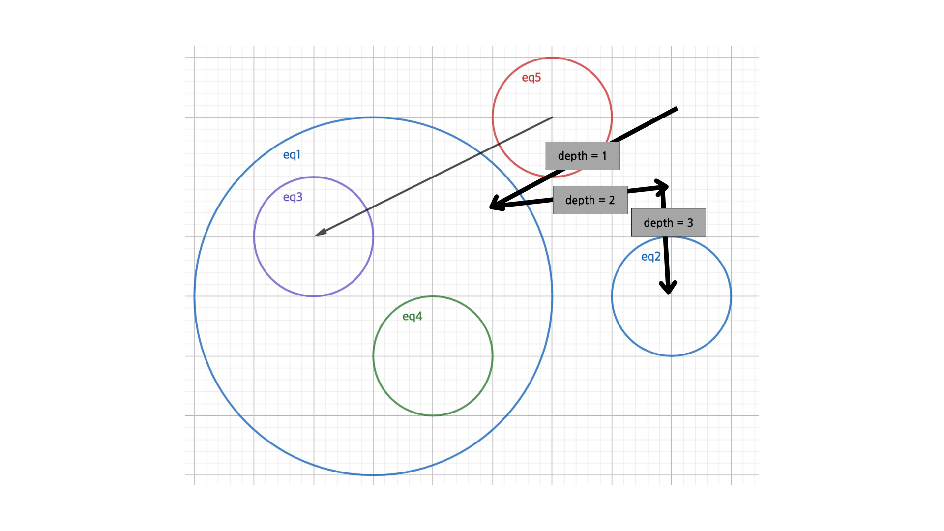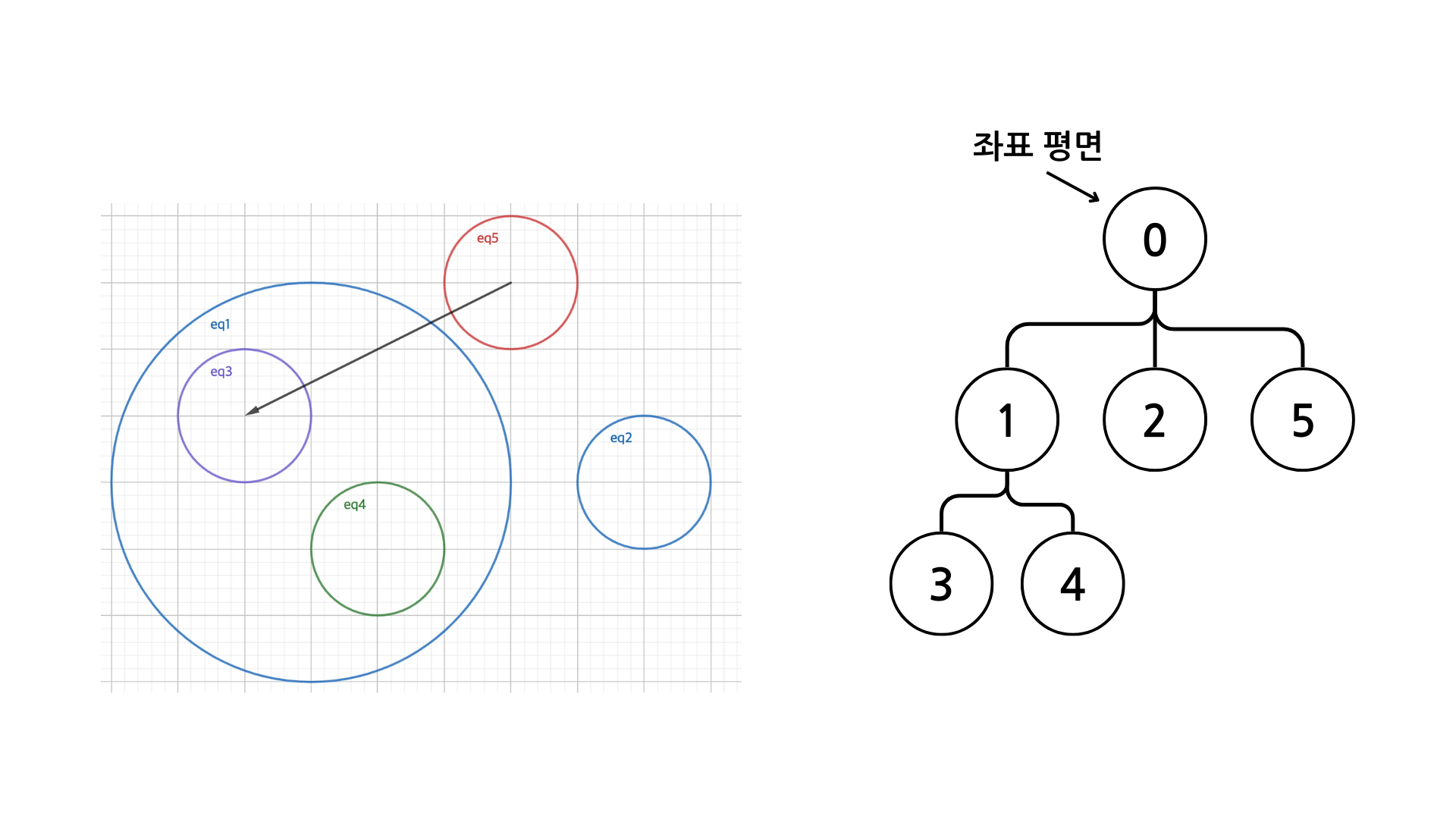 그리고 이 사실을 이용해서 원이 내부에 있는 경우 반지름이 큰 원은 부모, 작은 원을 자식으로 하여 아래와 같이 트리를 만들수 있다.