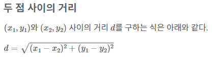 문제의 힌트에 나와있는 '두 점 사이의 거리'를 구하는 공식과