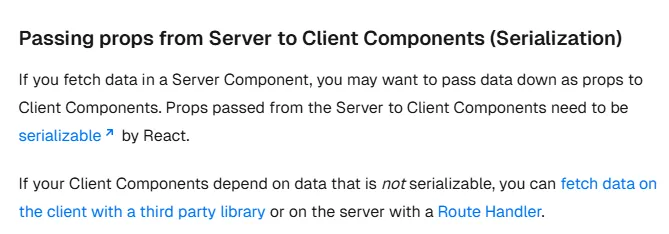 이는 서버에서 클라이언트 컴포넌트로 직렬화할 수 없는 데이터를 전달했기 때문에 발생한 에러다. Next.js 공식문서에는 이와 관련해 다음과 같은 내용이 적혀있다.