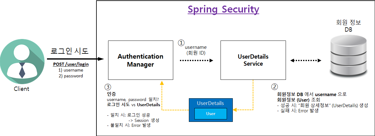 - 로그인 시도 -> username, password 정보를 HTTP body로 전달 (POST) -> Service에 회원 정보 요청 -> DB에서 회원 정보 조회 -> 인증 성공 시 세션에 로그인 정보 저장