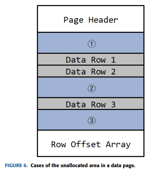- 페이지 맨 끝에는 row offset array이 있어서 각 record의 시작 위치를 적어둔다. 일종의 좌표 리스트 개념. 이 좌표와 record의 길이를 비교해서 삭제된 흔적, 빈칸을 찾는다. 본 연구에서는 빈칸이 생기는 경우로 다음 세 가지 케이스를 제시함. 페이지 헤더 아래(첫 레코드 위쪽), 레코드와 레코드 사이, 마지막 레코드와 raw offset array 사이