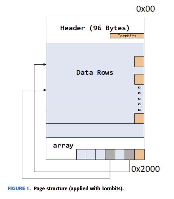 - TornPageDetection: 페이지를 디스크에 기록할 때 전원이 꺼지는 등 장애가 발생하면, 페이지 일부 단위만 쓰이고 나머지가 불완전하게 기록될 수 있다. 이를 방지하기 위해 특정 바이트의 하위 2비트를 TornBits 값으로 치환하여 저장한다. 페이지를 다시 불러올 때, TornBits와 교체된 비트를 비교해 손상 여부를 판단한다. 디스트 입출력 오류로 일부 바이트가 꺠지더라도 TornBits와의 대조를 통해 손상 여부를 감지할 수 있는 구조이다. NTFS 파일 시스템은 섹터 손상을 막기 위해 페이지 끝부분에 교정용 값을 넣어두는데, MSSQL의 TornPageDetection은 이 개념을 차용한 것이다.