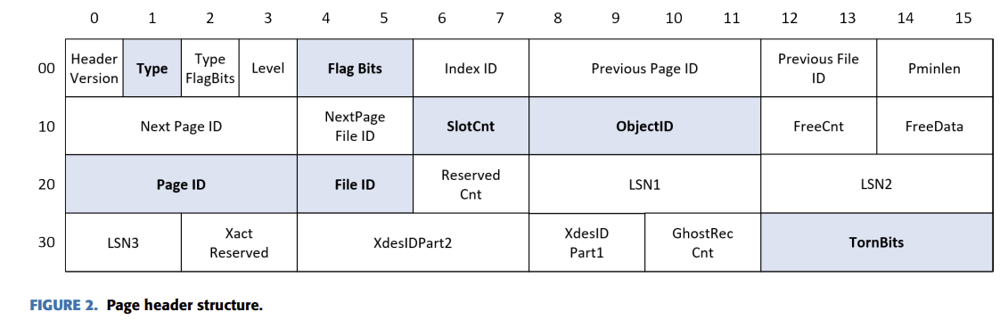 각 페이지는 페이지 헤더(약 96byte 크기의 메타데이터), 데이터 행(실제 레코드가 저장되는 영역), 행 오프셋 배열(각 행의 시작 위치를 가리키는 인덱스)로 이루어진다. 페이지 헤더에는 페이지 타입, 슬롯 수, 페이지 ID, 파일 ID, 체크섬 등 복구에 필수적인 메타데이터가 기록된다. 구체적으로 다음과 같다.