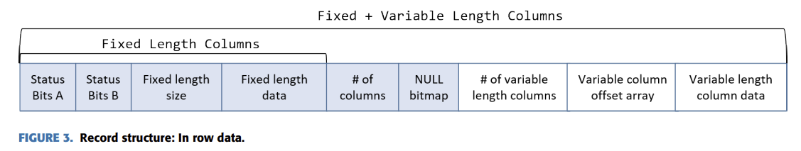In-row는 고정 길이 데이터와 가변 길이 데이터를 순차적으로 저장하는 구조를 가진다. 레코드가 너무 커지면 여러 페이지에 걸쳐 저장되며, 이 경우 포인터를 통해 LOB 페이지(텍스트·이미지 등 대용량 데이터 저장용)와 연결된다.