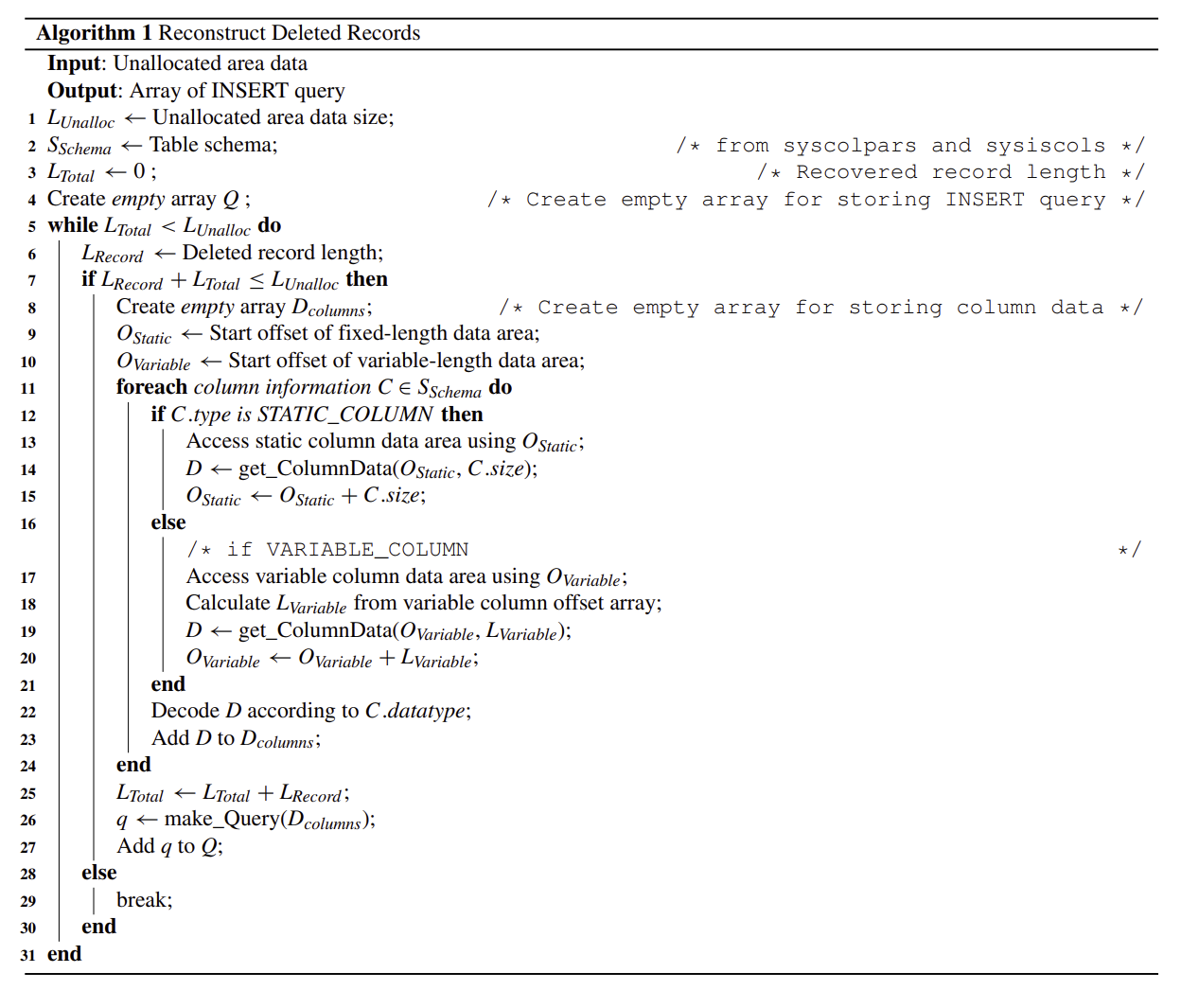 마지막 단계에서는 데이터 페이지의 Unallocated Area(삭제 후 비워진 영역)를 탐지하고, 고정 길이/가변 길이 데이터를 구분해 레코드를 재구성한다. 알고리즘은 레코드의 컬럼 순서와 데이터 타입을 참조하여 데이터를 해석하고, 최종적으로 INSERT 쿼리 형태로 복구된 레코드를 출력한다.