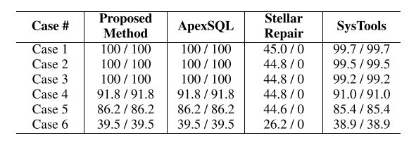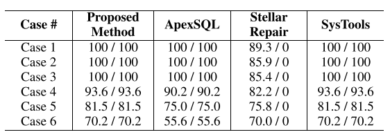 특히 LOB 데이터 복구에서 SysTools가 일부 끝부분 데이터를 누락한 반면, 제안 기법은 모든 데이터를 완전 복구하였다.